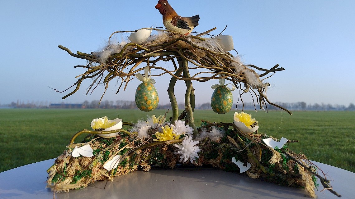 Deelnemers werken met een halve krans, kronkelwilg en verschillende voorjaarsdecoraties om een sfeervol voorjaarsstuk te maken. Begeleiding is aanwezig en voorbeelden staan klaar ter inspiratie.