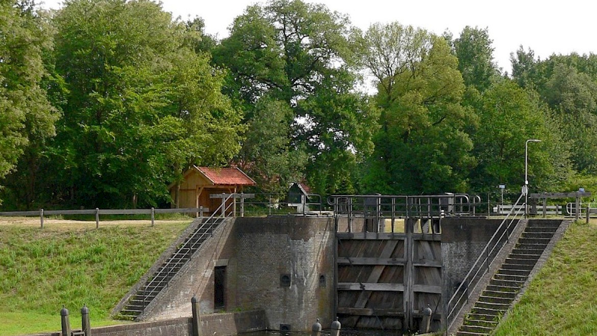 We fietsen weer verder over de Kasteellaan naar het kanaal Almelo Nordhorn en we volgen dit fietspad langs het kanaal. Wat verder komen we op een mooi punt: de Bij Dinkel en aan de overkant van het kanaal zien we, via een kleine brug over het kanaal, wandelend te bekijken: het Schuivenhuisje.