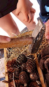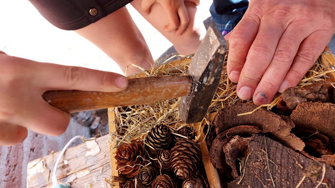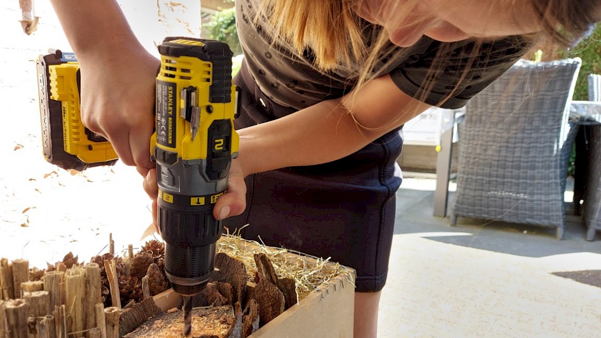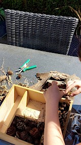 Elk vakje kreeg een bestemming. Denneappels in de één, sommige even vastzetten met het lijmpistool. Hooi in de ander met wat gaas ervoor. Met kleine krammetjes werd het gaas vastgetimmerd. Ook werd een stukje haardhout gebruikt, opgevuld met boomschors. In het stukje boomstam mocht Nyne zelf gaatjes boren. De holle bloemenstengels werden op maat geknipt met de snoeischaar (sommige steeltjes hield Nyne bewust wat langer dan de ander. Maar in de professionele insectenhotels hebben de steeltjes een gelijke hoogte). Als laatste bedacht ze dat de vlinders nog een plekje moesten krijgen. Een stukje resthout en wederom met de boor werden gleufjes geboord. Dit is natuurlijk geen goede plek voor vlinders (want daarvoor moet je een holle ruimte afdekken, vullen met takjes voor de vlinders om op te zitten en afdekken met een stukje hout waar smalle gleuven in zitten). Maar een creatief idee van zo'n enthousiaste dame laten we maar even voor wat het is.