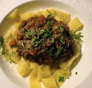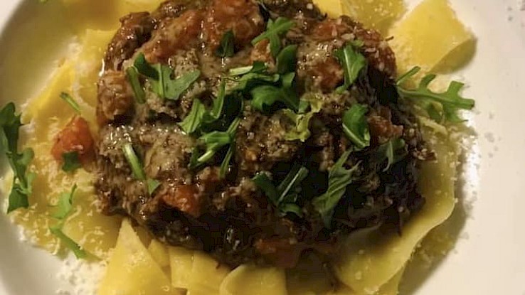 Serveren met papperdelle (of andere eierpasta) wat Parmezaanse kaas en een paar blaadjes rucola. Dit recept is ook te maken met behulp van een slowcooker.