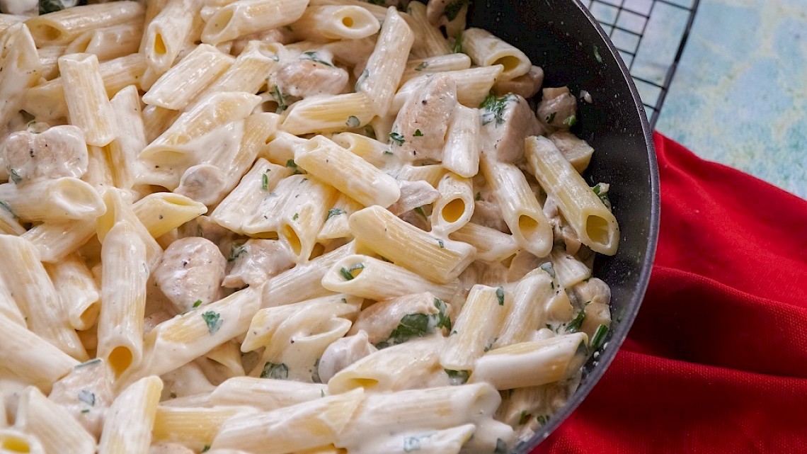 - Kook, terwijl je de kip laat afkoelen, de pasta - met een snifje zout - gaar volgens de verpakking