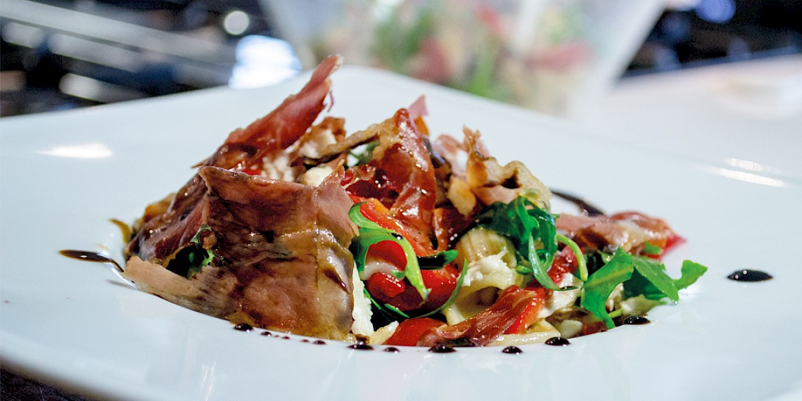 • Verdeel de parmaham over een met bakpapier beklede bakplaat en bak in circa 6 minuten krokant. Laat afkoelen en breek in stukken.