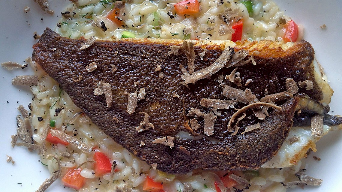 Bak op het laatst in een pan met anti-aanbaklaag de tarbotfilets krokant bruin. De presentatie: schep de risotto in een diep bord, leg de tarbotfilets erop en rasp als een volleerde Italiaanse kelner royaal de truffel erover.