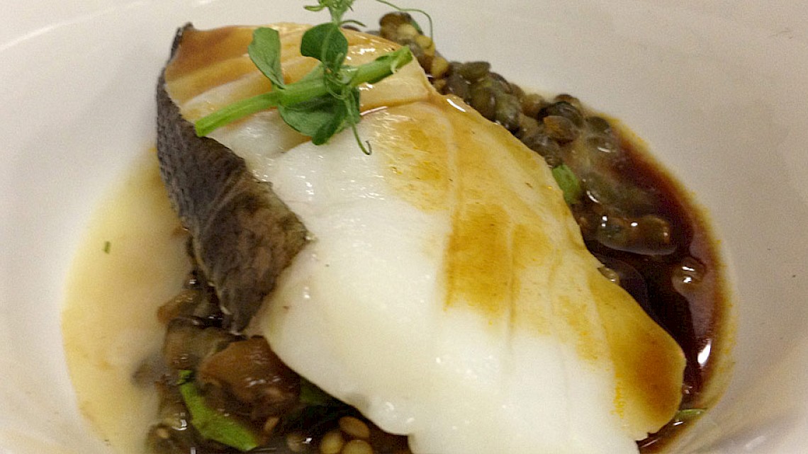 Stel de oven in op 90º Celsius. Voeg bij een combi-oven 40 % vocht toe of zet een bakje water in de oven voor voldoende vocht. Doe de linzen in een schaal. Leg hierop de in plakken gesneden kabeljauw en zet de schaal in de oven.