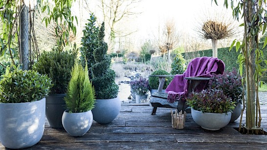 Maak van je balkon of terras een kleurrijk winterhoekje met groenblijvers en bloeiende planten als Helleborus, Camellia en Skimmia. Flexibel tuinieren met potten: makkelijk én sfeervol!