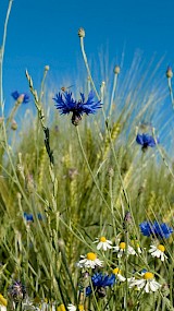 De Korenbloem heeft helderblauwe bloemen. Vroeger kwam deze akkerbloem zeer veel voor, maar de korenbloem is sterk achteruit gegaan. Ze bloeien maandenlang als je de verwelkte bloemen er tussenuit haalt. Zaaien: bij voorkeur in de volle grond in mei, ze houden niet van verplaatsen.