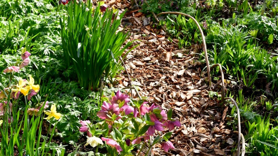 • Een gemengde haag van hulst (Ilex aquifolium), liguster, kardinaalsmuts, mahoniestruik en kamperfoelie biedt nestgelegenheid en bescherming aan vogels. Jo vlecht in het voorjaar de takken in elkaar zodat de smal gesnoeide haag op de erfgrens toch mooi dicht groeit.
