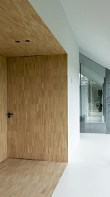 De kasten, de keuken en badkamer zijn mooi op maat gemaakt door een interieurbouwer uit de buurt. Het aanleggen van een gietvloer is best ingewikkeld, zeker in dit huis met alle niveauverschillen. Onder ons huis hebben we zelf een hele technische ruimte ingericht waarin vloerverwarming en ventilatie worden aangestuurd. Voor het toepassen van de domotica kregen we hulp van en installatiebedrijf. Tegen de gevel en op het dak is geplatoniseerd vurenhout bevestigd. In de glaspui bij de woonkamer wilden we een schuifdeur maken van 4,5 meter hoog. Het was ingewikkeld om een leverancier te vinden voor dit uitdagende deelproject.