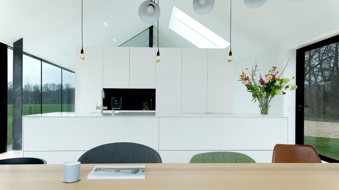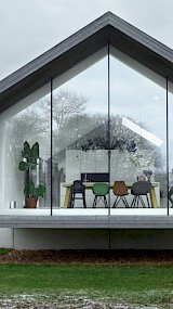 De vorm van het schuurhuis is eenvoudig: zoals een kindertekening van een huis met rechte muren en een puntdak. Dennis liet zich daarvoor inspireren door het Vitrahaus, een designmuseum in het Duitse Weil-am-Rhein. Dat bestaat uit opeengestapelde huizen met een puntdak en een glazen voorgevel. “Wel heel anders dan ik me ooit mijn droomhuis had voorgesteld. Door een grondige landschapsanalyse kwamen we op het idee van een eigentijdse schuurwoning. Dit vonden we een passende invulling in dit oude, Twentse coulissenlandschap.”