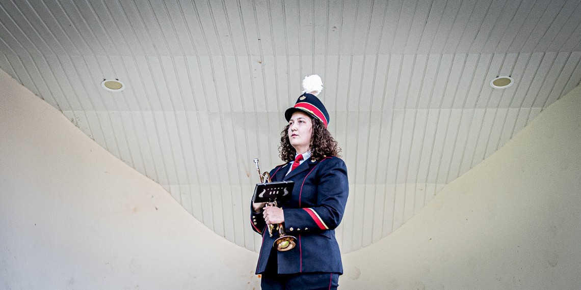 Merel Lievestro, student conservatorium, was een van deze zeven. Zij koos voor de muziekkoepel die verbonden is aan de muziekvereniging. Deze keer stond ze er alleen, wat een bijna 'hoorbaar' en zichtbaar verstild beeld opleverde, van zowel het moment van de Taptoe, als vlak daarna. Toen in de verte nog een van andere trompettisten te horen was die zijn eigen plek had gekozen op deze bijzondere 4 mei in Coronatijd...